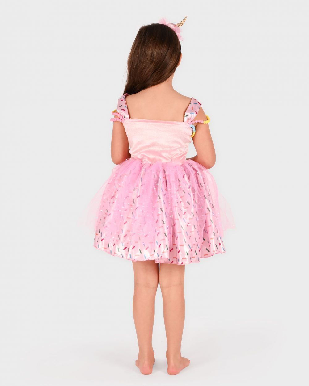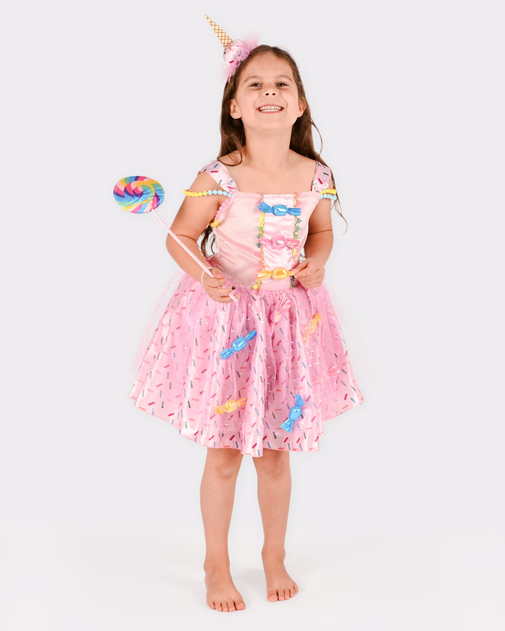Klänningen SMASKIG är en rosa dröm med strösseldetaljer och färgglada karameller som får varje liten gottegris att le. Den perfekta klänningen för födelsedagsfirande och sockersöta lekar.